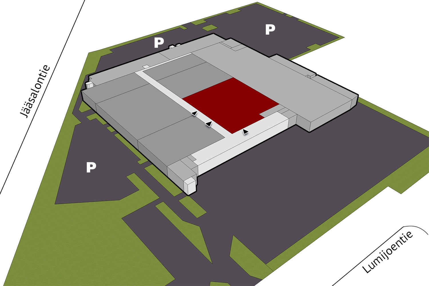 Saavutettavuus erinomainen, ja pihassa erittäin hyvät paikoitusmahdollisuudet. Pihaan tullaan asentamaan sähköautojen latausmahdollisuus.